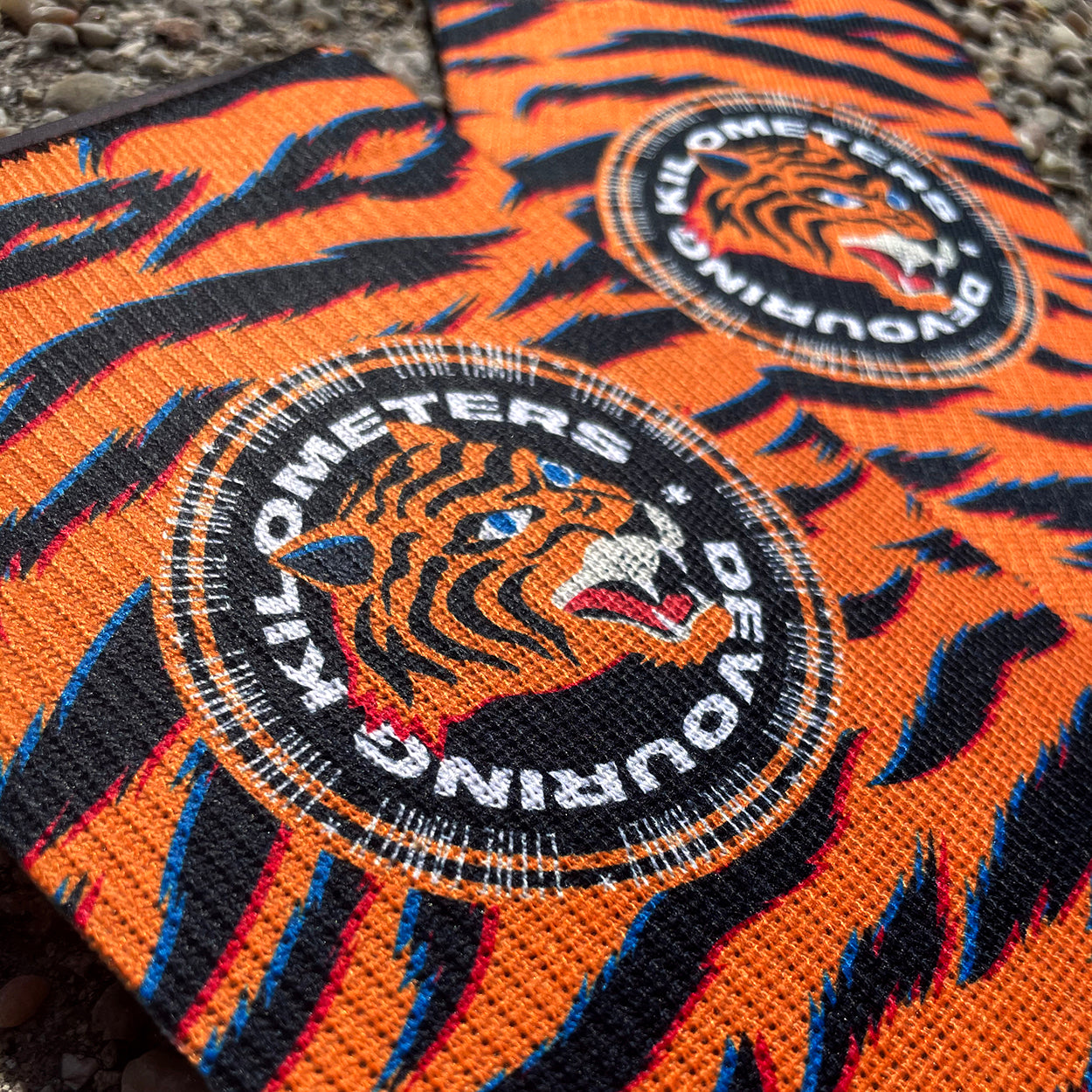 Tiger animal print in orange and black. With the LitheApparel Tiger badge: Devouring Kilometers.