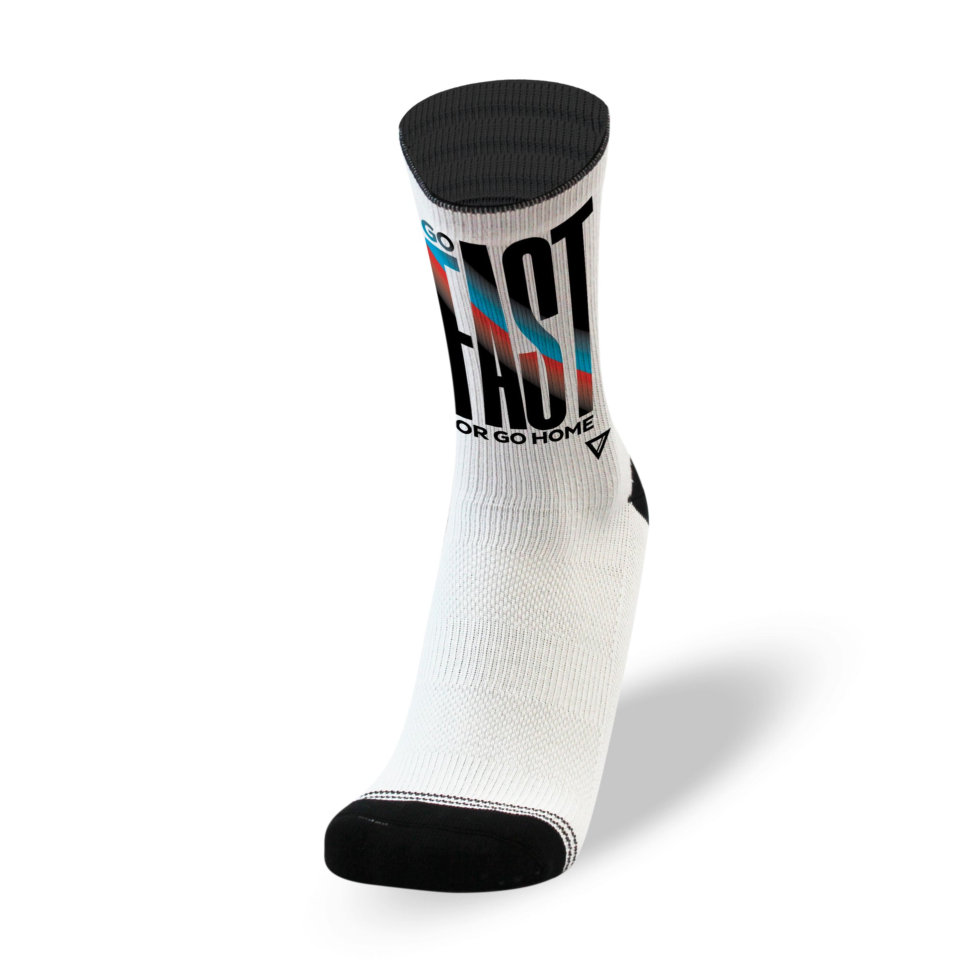 White socks. If you run or ride: GO FAST OR GO HOME in black with a blue/red gradient.
