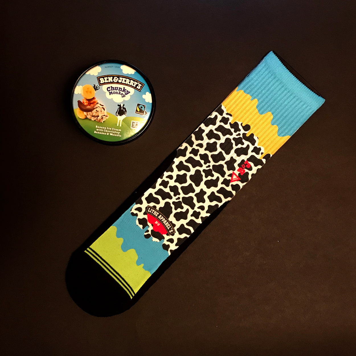¿Who doesn't love Ben and Jerry's? Socks inspired by the best ice cream. Our tribute to our favourite ice cream: Ben & Jerry's. Cow's print with ice cream dripping.