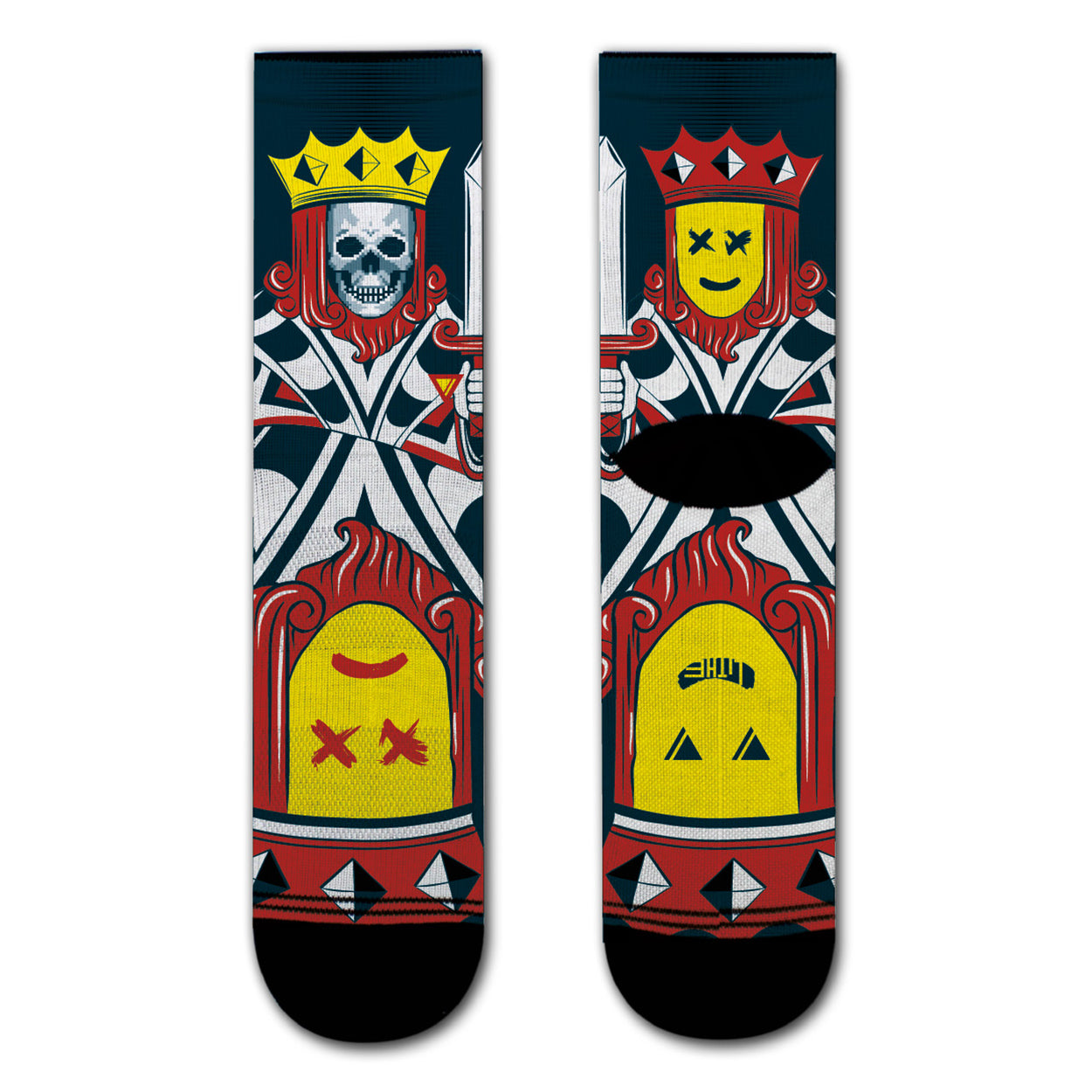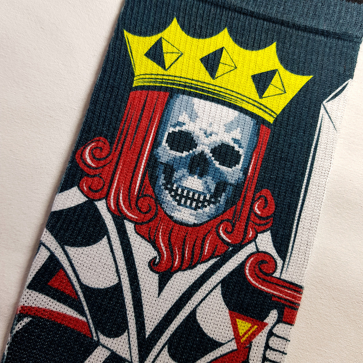 The king of poker card hacked with a pixelated skull on the front and a yellow smiley on the back... it seemed like a crazy idea at first... but it's one of the Lithe Apparel icons that other brands have tried to copy, without success ... you can keep trying, the king is here.