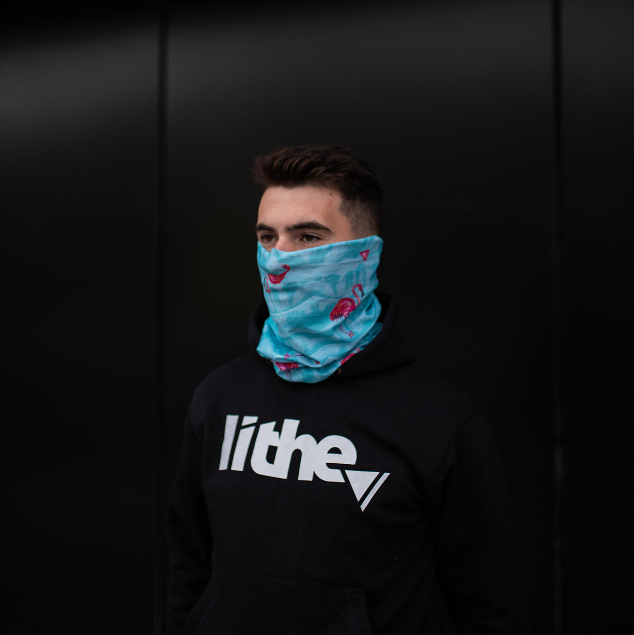 Neck warmer with pink flamingos, on a background of tropical leaves in shades between blue and green. Matching socks and headband available.