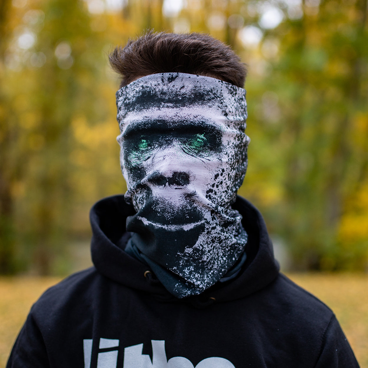Neck warmer with illustration of a gorilla based on splashes of black and white ink. Matching socks and headband available.