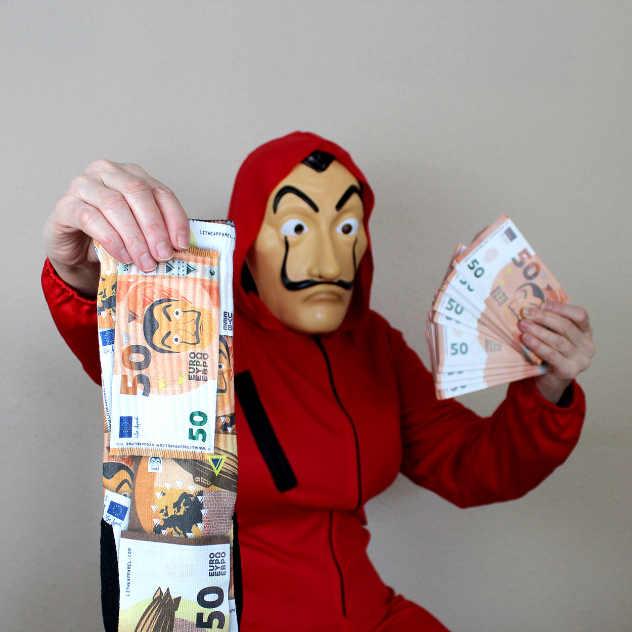 La casa de papel (Money Heist) socks, with the 50 euros notes with the Dalí mask on them.