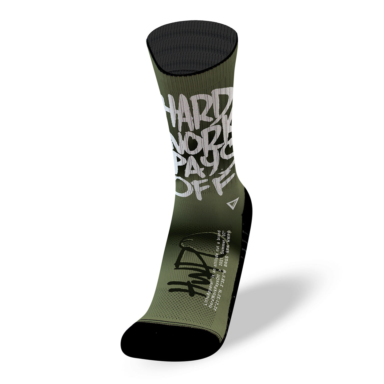 Socks with one of our Hard Work Pays Off [HWPO] mantras.