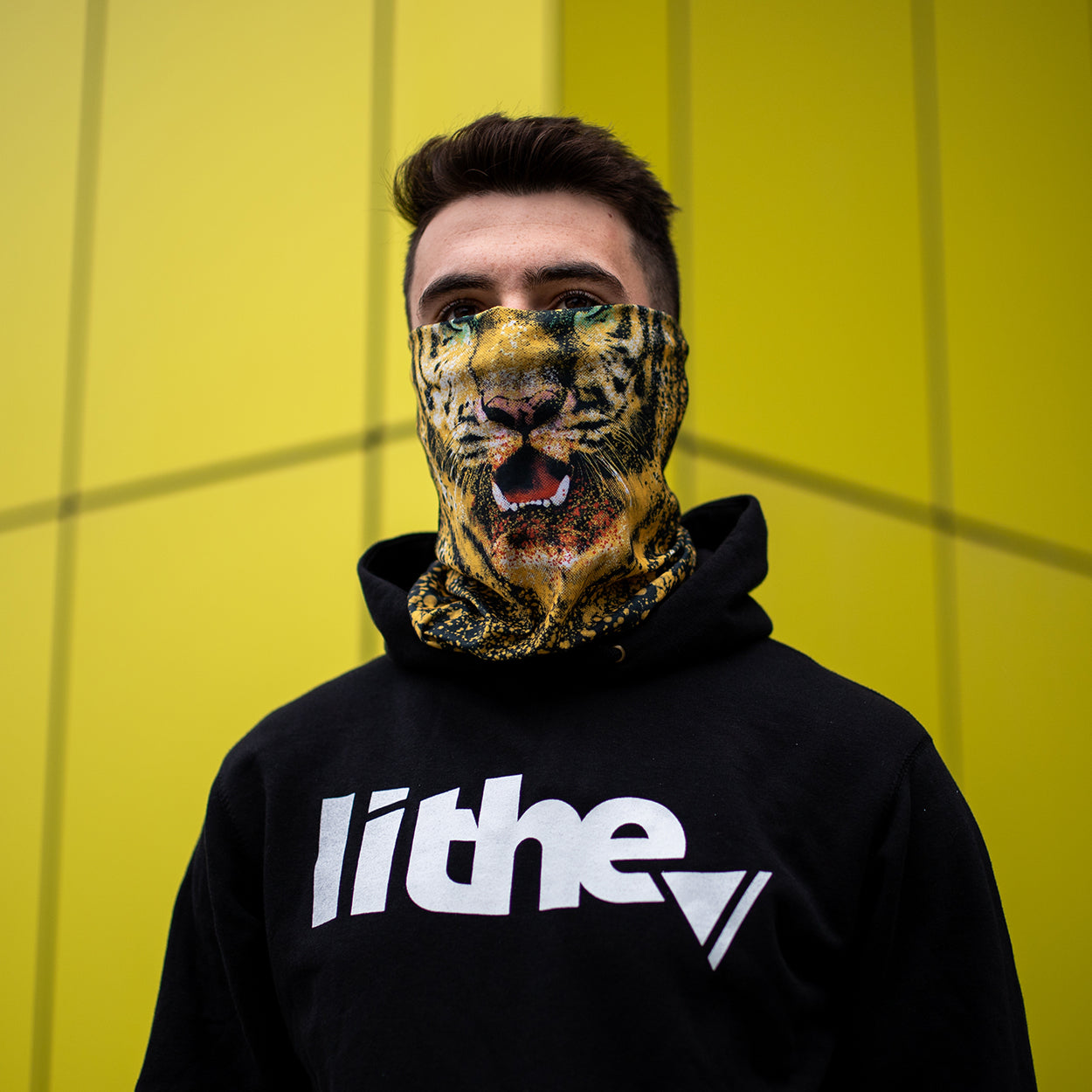 Neck warmer with illustration of a tiger based on splashed with yellow and black ink mainly socks and matching headband, available.